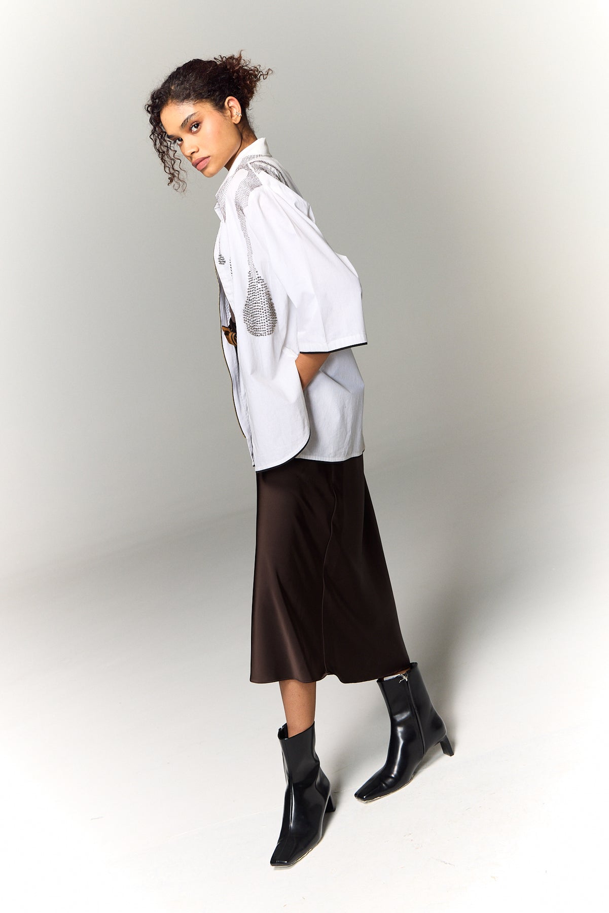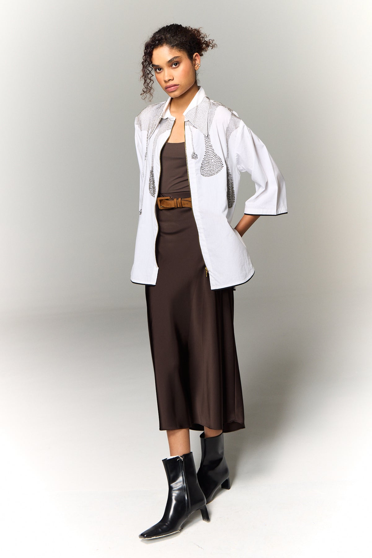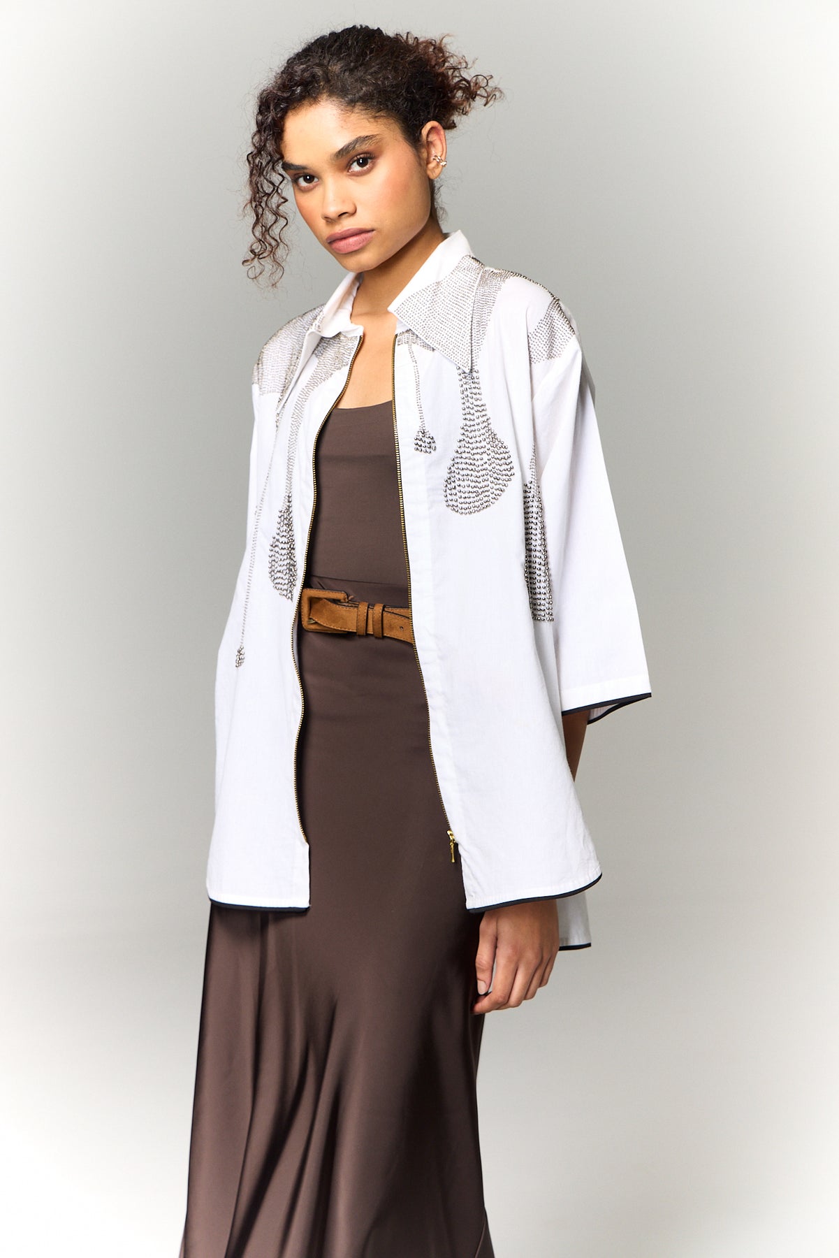 White cotton shirt featuring metal stud hand embellishment in fluid, drop-like motifs over exaggerated collars and chest. Contrast piping and gold zipper add a bold, modern finish.