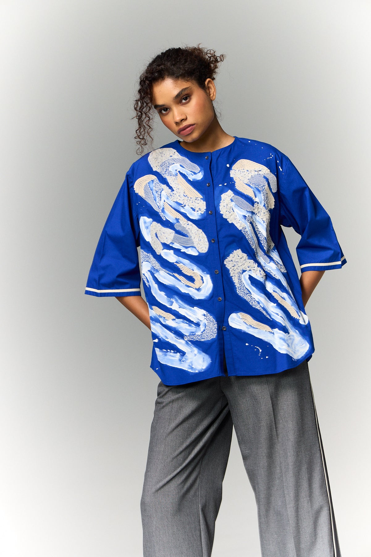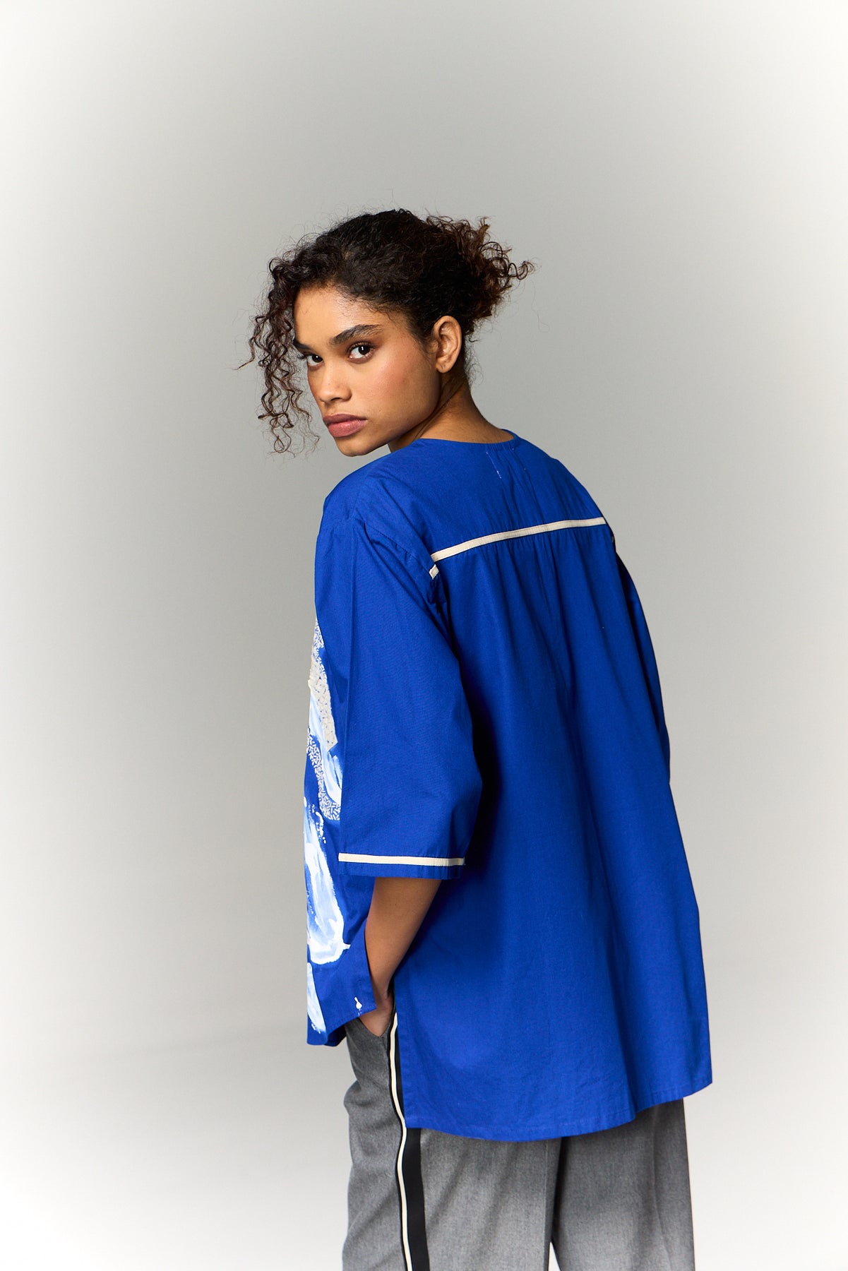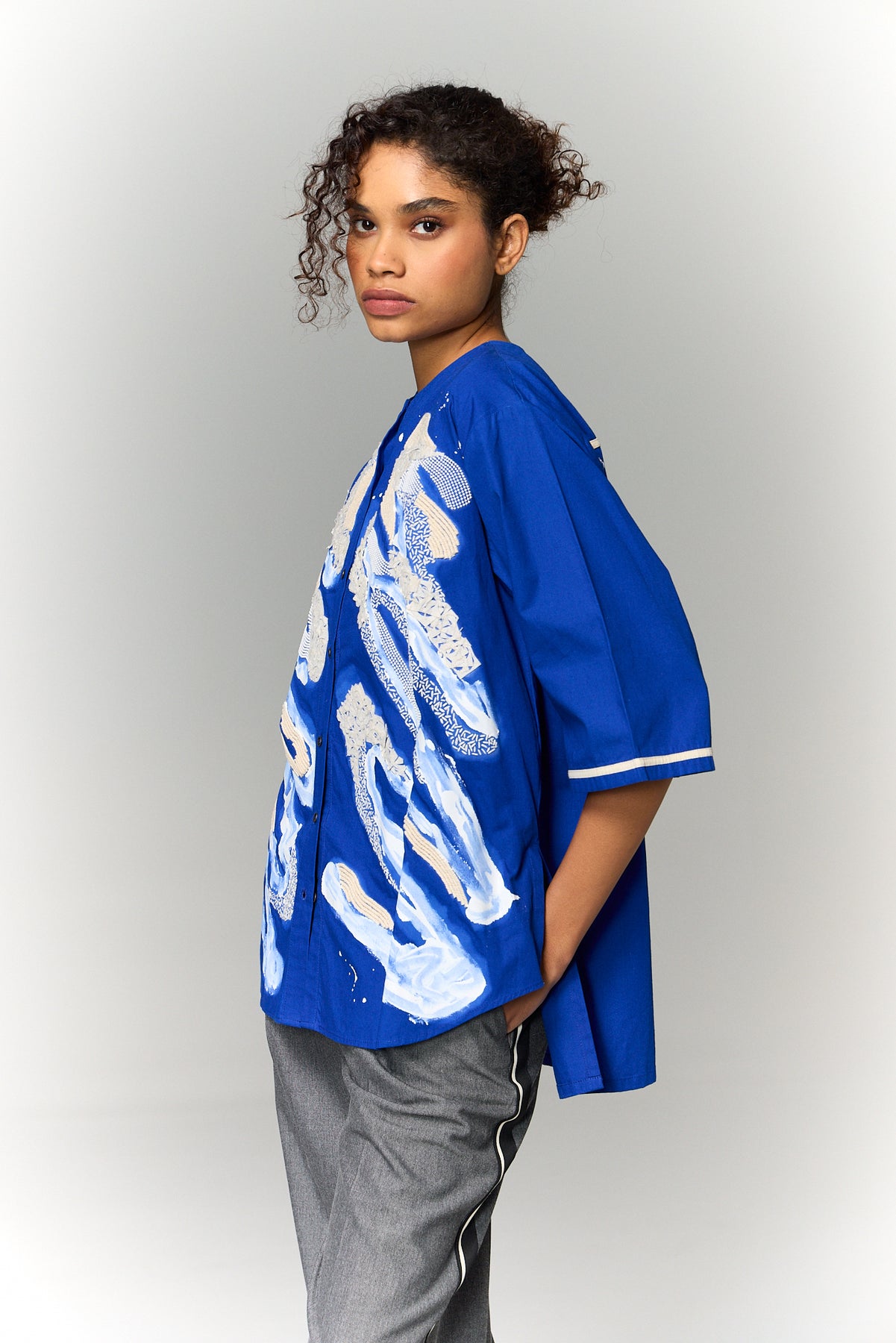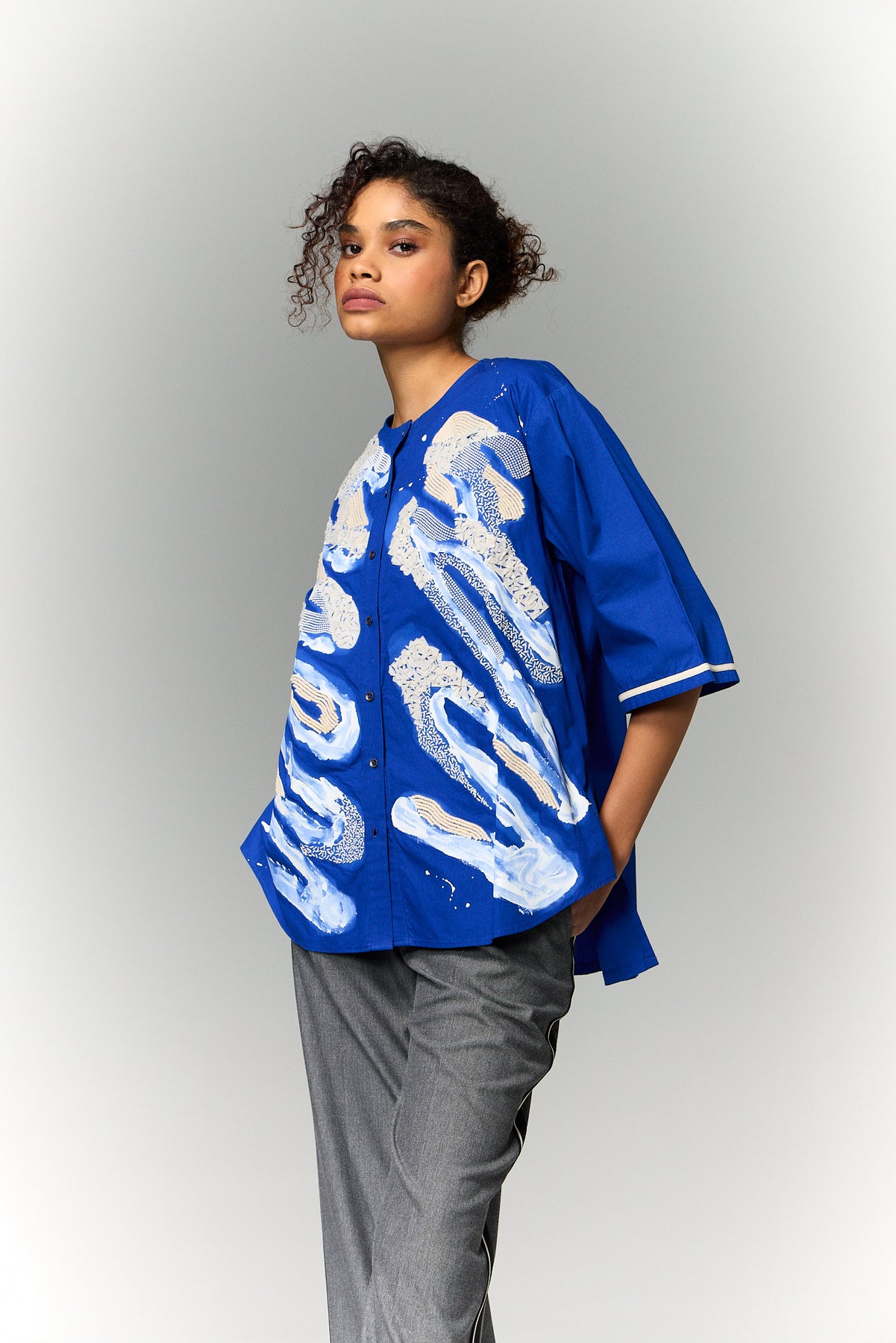 Hand-painted abstract strokes with layered textures, featuring thread embroidery, dotted detailing, and textured fabric appliqué. The bold cobalt canvas is elevated with artistic expression and subtle metallic accents on cuffs.