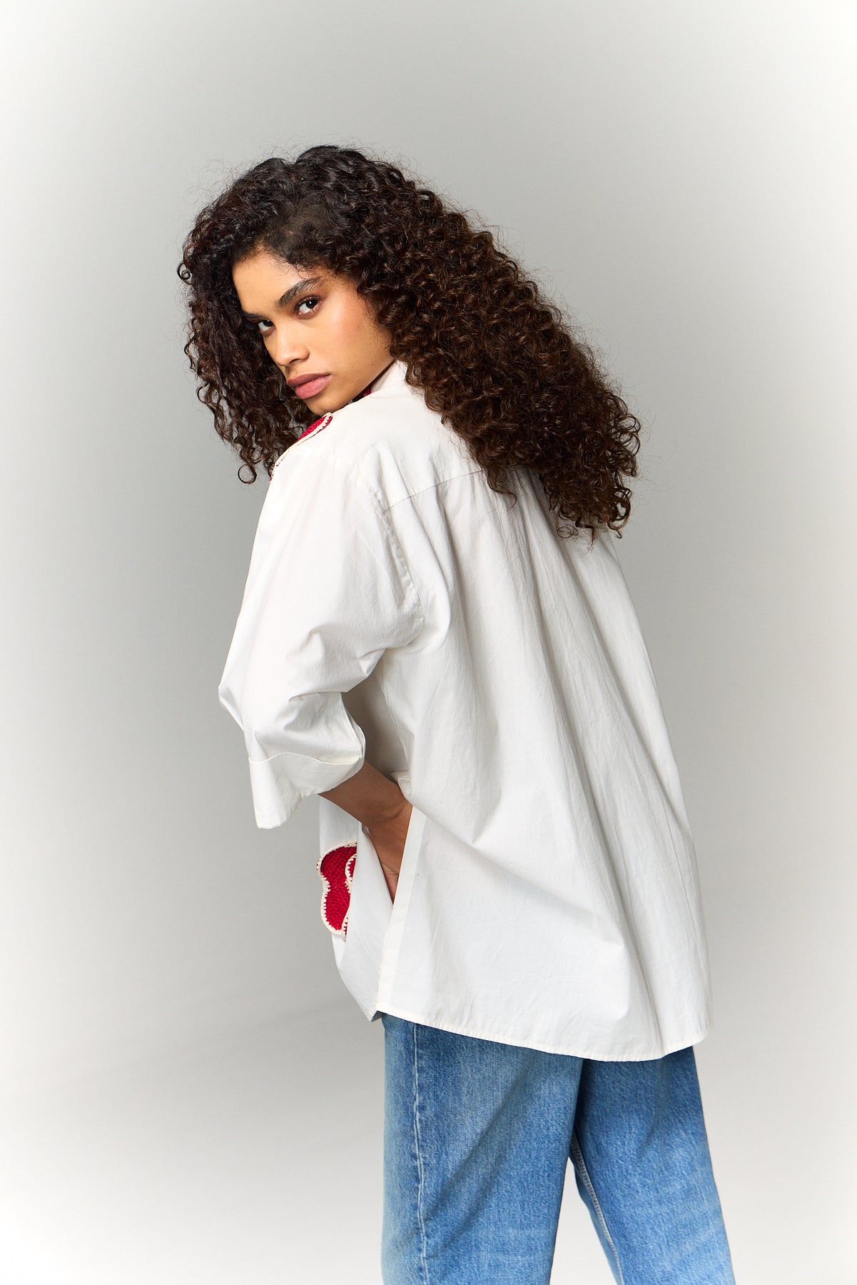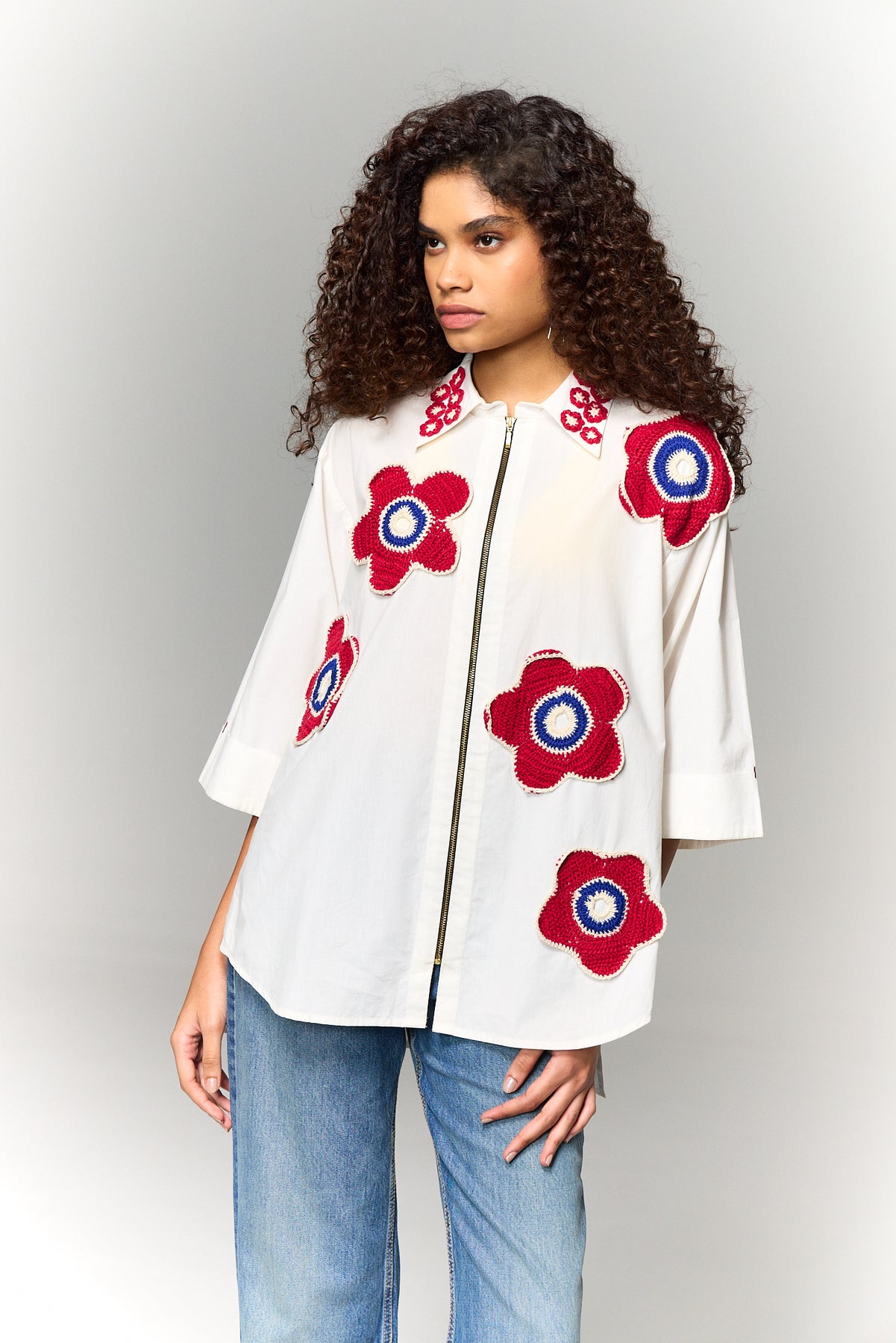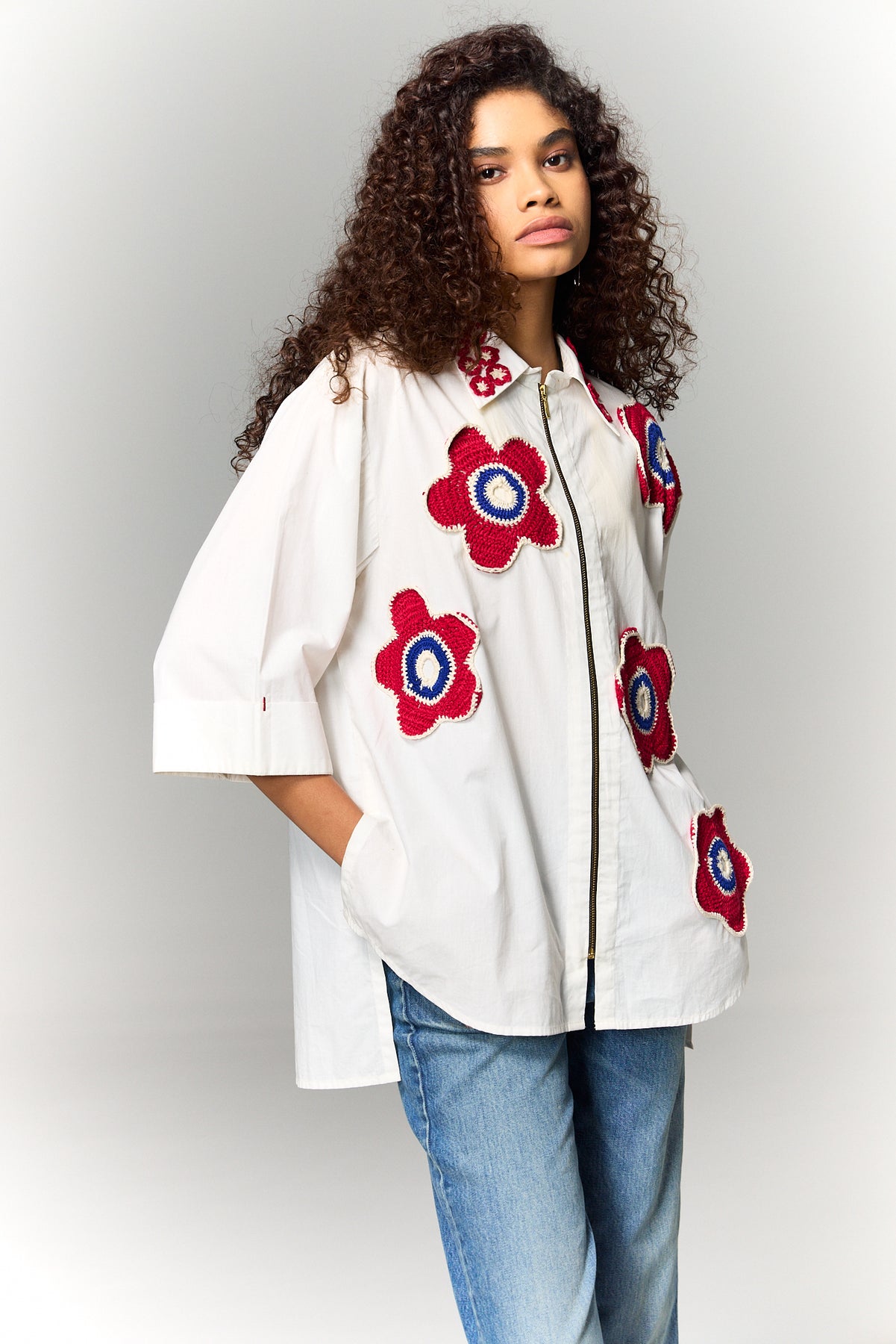 Crafted in  White, this shirt showcases bold, hand-crocheted floral appliqués. Featuring a captivating "evil eye" motif, these dimensional elements create a whimsical, folk-art inspired composition with rich texture.