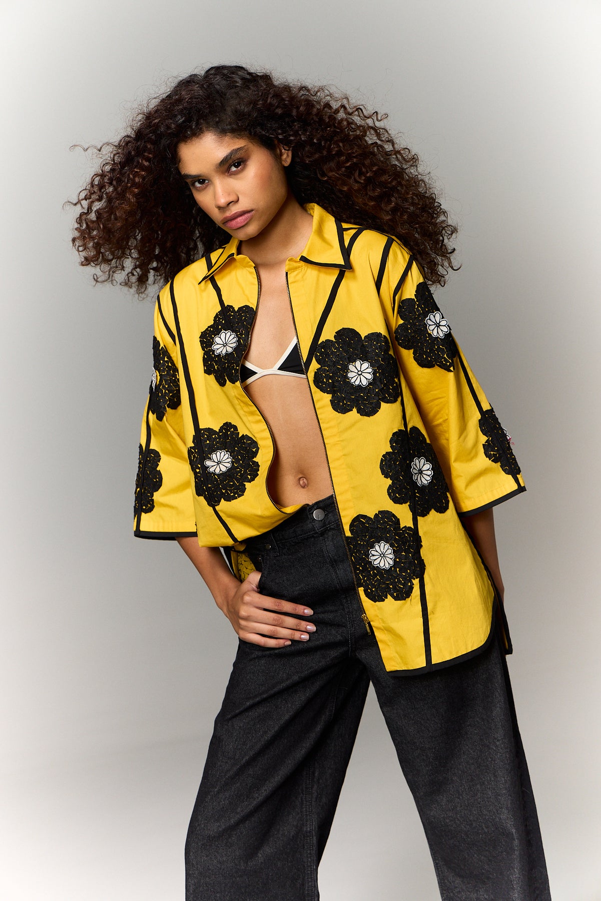 Bold yellow shirt accented with oversized black floral appliqués and sharp geometric piping. The structured zip-up design with elbow-length sleeves and patch pockets blends playful charm with confident, modern tailoring.