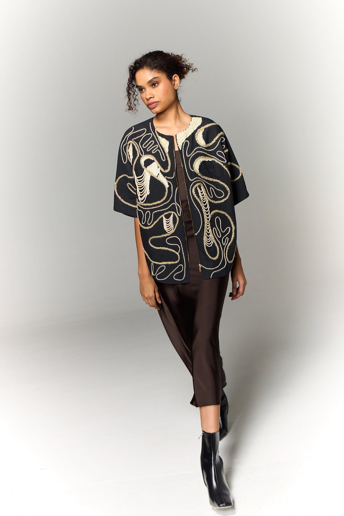 This sculptural black jacket features intricate ivory embroidery and textured rope details. Its structured silhouette and zip closure contrast beautifully against the fluidity of a satin slip dress underneath.